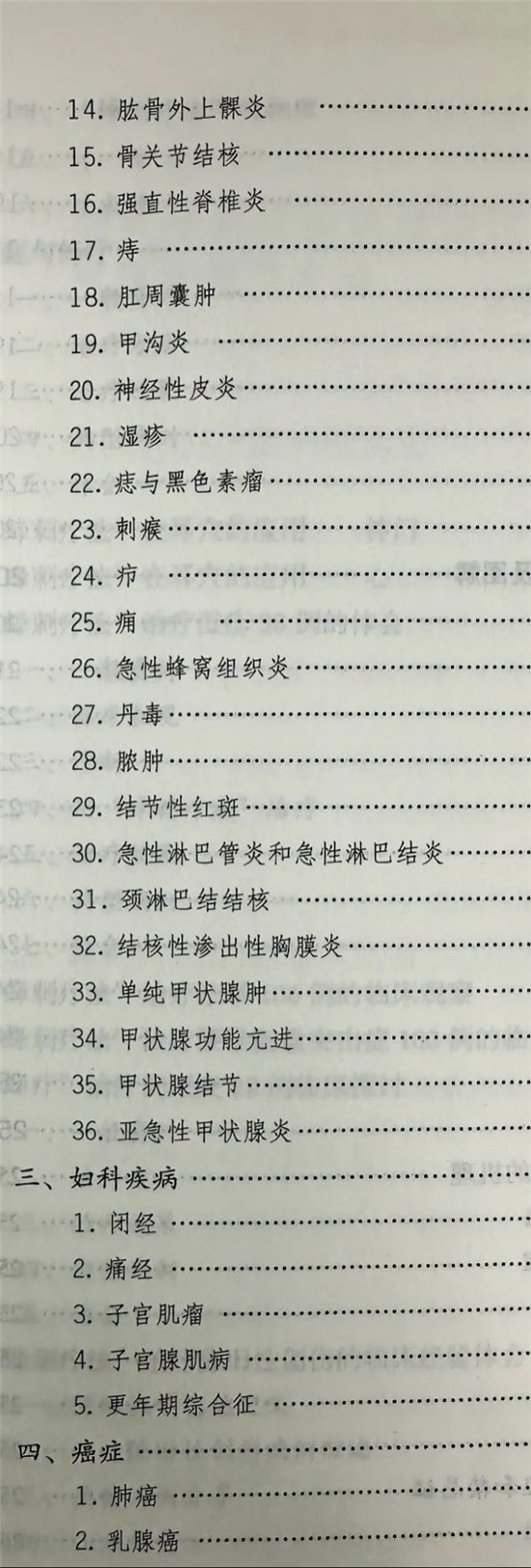 涉及病种有风湿、类风性关节炎;强直性脊柱炎;骨性关节炎;关节炎;膝关节半月板损伤;滑膜炎;颈椎病;肩周炎;肩颈病;网球肘;感冒;鼻炎;咳嗽;静脉曲张;更年期综合症;子宫术后粘连拉伤;前列腺炎;慢性支气管炎;哮喘;坐骨神经痛;创伤;陈旧性创伤;三叉神经痛;偏头痛;皮肤过敏;键翘炎;键翘囊肿;带状泡疹;湿疹;神经性皮炎;踝关节损伤;腰椎间盘突出、膨出;急性膀胱炎;前列腺炎;Ⅱ型糖尿病;心脏病;高血压;子宫摘除术后粘连拉伤;耳鸣;小脑萎缩;荨麻疹;牙痛;便秘;子宫肌瘤;腹膜炎;牙神经损伤;急性腰扭伤;骨质增生性痛疼;骨折;甲状腺结节;胃痛。曾治疗好常见病与慢性病以及妇科疑难病。