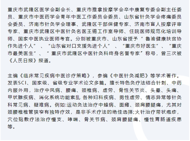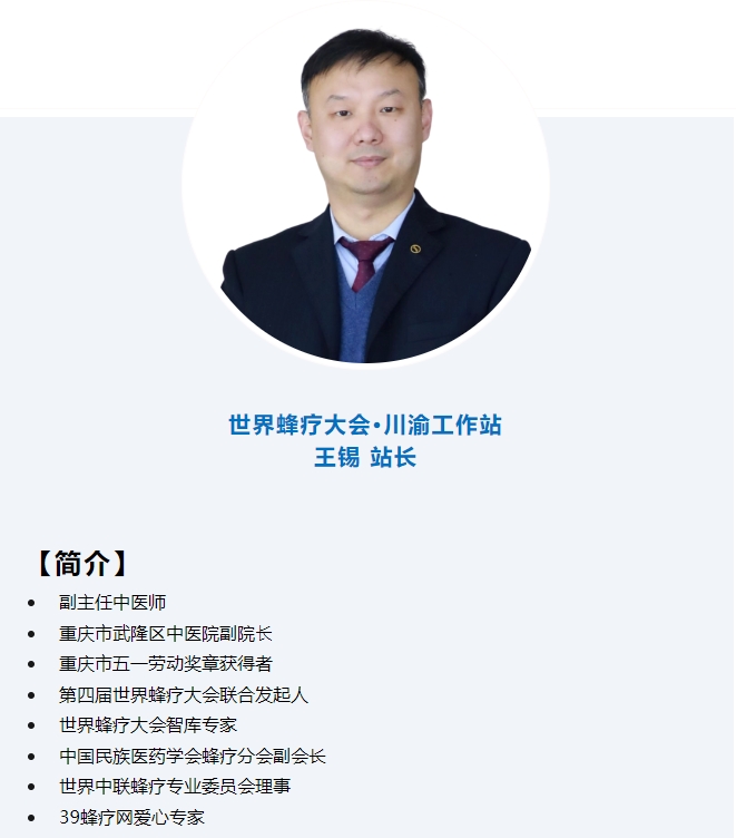 “ 蜂疗,作为一种自然疗法,近年来在全球范围内受到了越来越多的关注。其利用蜜蜂产品及其衍生物来治疗各种疾病,具有独特的疗效和优势。特别是在应对一些现代医学难以解决的慢性疾病和疑难杂症方面,蜂疗展现出了巨大的潜力。”世界蜂疗大会·川渝工作站“ 依托重庆市武隆区中医院普及开展蜂疗特色疗法,为该地区百姓带来福祉!武隆区中医院副院长、第四届世界蜂疗大会联合发起人:王锡将担任川渝地方工作站站长。