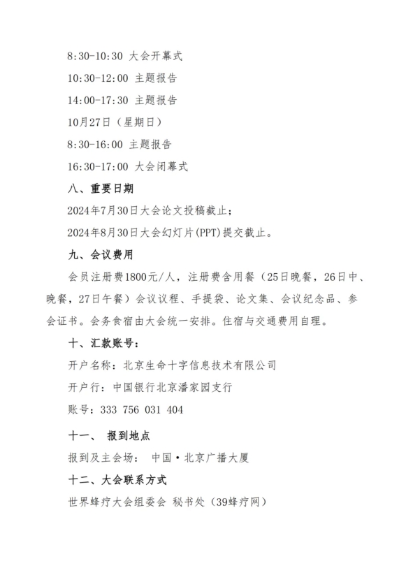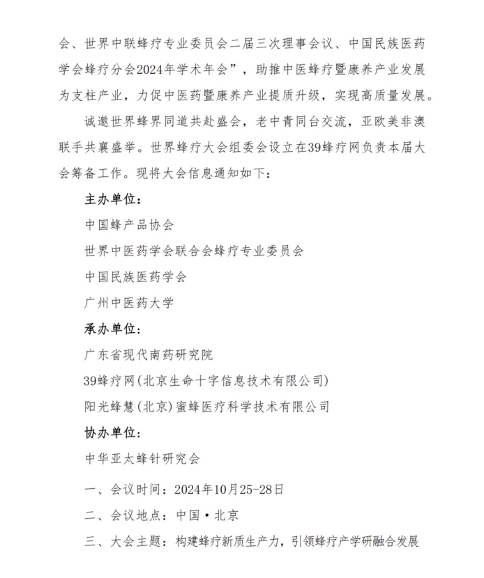 诚邀世界蜂界同道共赴盛会,老中青同台交流,亚欧美非澳联手共襄盛举。世界蜂疗大会组委会设立在39蜂疗网负责本届大会筹备工作。现将大会信息通知如下: