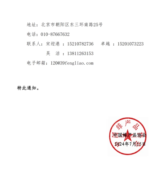 第五届世界蜂疗大会定于2024年10月25-27日在中国·北京召开。同期将召开“中国蜂产品协会蜂产品保健专委会换届工作会、世界中联蜂疗专业委员会二届三次理事会议、中国民族医药学会蜂疗分会2024年学术年会”,助推中医蜂疗暨康养产业发展为支柱产业,力促中医药暨康养产业提质升级,实现高质量发展。