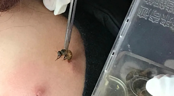3、将蜜蜂的尾部直刺穴位或痛点,蜜蜂被激怒后便会执行蜇刺动作,后将蜜蜂置盛水容器内。