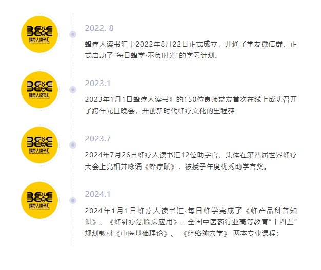 2024年,一项链接产业与个人、文化与技能、现在与未来的宏大公益行动蓬勃开展,近一年的时间里,20多位知名蜂疗专家指导,12位优秀助学官引领,150位领读人共同助力,上万名领读人以书香致敬时代,以阅读耕耘未来,这就是由世界蜂疗大会ICA、39蜂疗网助力发起的“蜂疗人读书汇”。