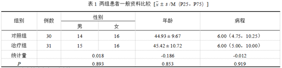 共收集病例66例,脱落5例,最终收集有效病例61例。对照组病程4~36个月,治疗组4~30个月。两组基线特征差异均无统计学意义(P>0.05),详见表1。