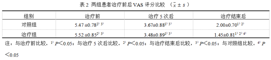 表2显示,治疗前两组患者疼痛评分差异无统计学意义(P>0.05)。治疗后两组组内比较差异均有统计学意义(P<0.05);组间比较只在治疗结束后差异有统计学意义(P<0.05)。
