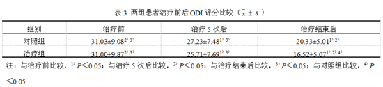 表3显示,治疗前两组患者腰部功能障碍评分差异无统计学意义(P>0.05)。治疗后两组组内比较差异均有统计学意义(P<0.05);治疗结束后,组间比较显示治疗组评分明显低于对照组,差异有统计学意义(P<0.05)。