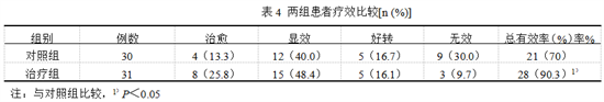 表4结果显示:治疗组总有效率为90.3%(28/31),疗效优于对照组70.00%(21/30),差异有统计学意义(P<0.05)。