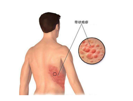 发疹前可有轻度乏力、低热、纳差等全身症状,患处皮肤自觉灼热感或者神经痛,触之有明显的痛觉敏感,持续1~3天,亦可无前驱症状即发疹。好发部位依次为肋间神经、颈神经、三叉神经和腰骶神经支配区域。患处常首先出现潮红斑,很快出现粟粒至黄豆大小的丘疹,簇状分布而不融合,继之迅速变为水疱,疱壁紧张发亮,疱液澄清,外周绕以红晕,各簇水疱群间皮肤正常;皮损沿某一周围神经呈带状排列,多发生在身体的一侧,一般不超过正中线。神经痛为本病特征之一,可在发病前或伴随皮损出现,老年患者常较为剧烈。病程一般2~3周,水疱干涸、结痂脱落后留有暂时性淡红斑或色素沉着。