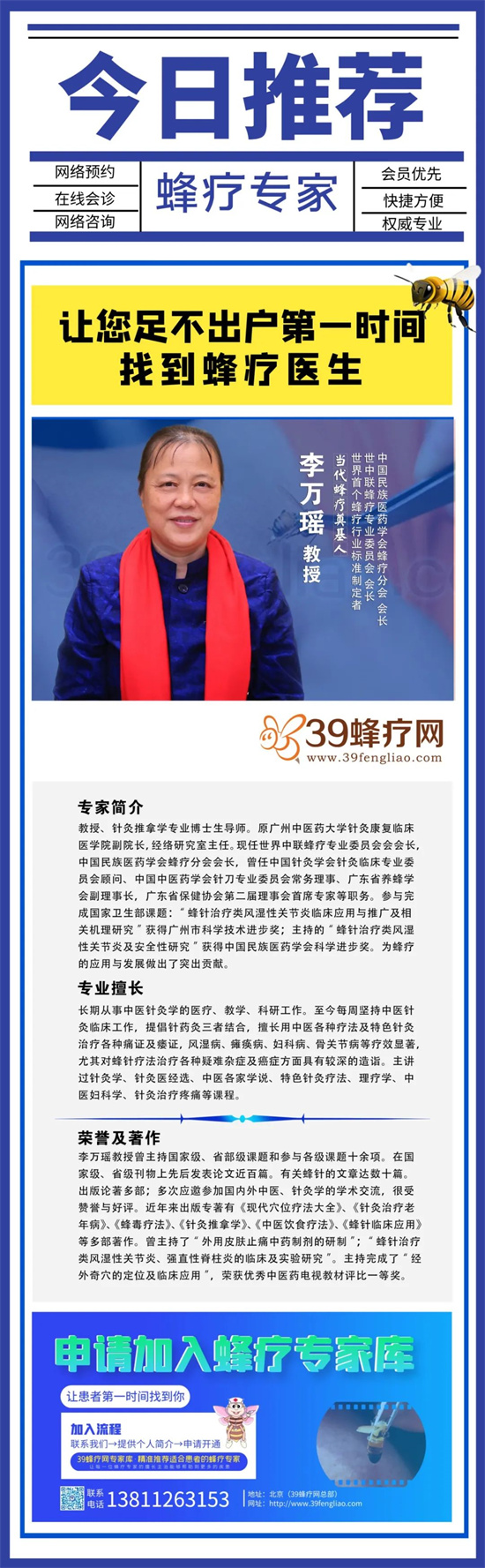 39蜂疗网知名专家团是由以当代蜂疗奠基人,著名蜂疗专家李万瑶教授领衔带队的国内资深蜂疗名家和专家们组成的爱心专家团队,为广大疾患提供疾病的咨询与解决方案;他们都拥有数十年临床经验和中医蜂疗多项研究成果。尤其是李万瑶教授至今已培养出了国内外上千名优秀蜂疗人才。