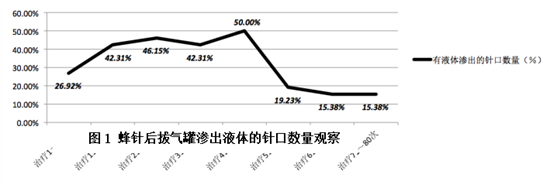 笔者门诊的癌症患者接受蜂针后大多采用了拔气罐的治疗方法,对就诊患者进行动态跟踪,将每次拔罐后有液体渗出的针口数量百分比进行统计,如图1所示。