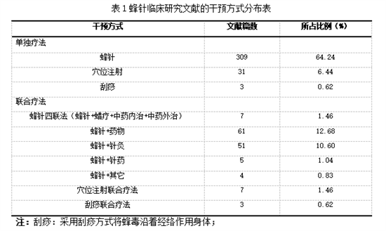 纳入的研究主要为期刊合计445篇(92.52%),少部分关于科技成果3(0.62%)。期刊来源前三的分别是《中国蜂业》77(17.30%),《蜜蜂杂志》62(13.93%),《养蜂科技》34(7.64%)。据统计第一作者分别来自34个城市(除外13篇未提及作者信息未纳入统计),多来自于市级,排名前五的地区分别是广东112,湖南46,江苏29,云南27,四川25,北京25,蜂针临床应用主要集中于南方地区。文献报道多为系列病例分析、个案报道与低质量研究,证据级别低。干预措施统计见表1。