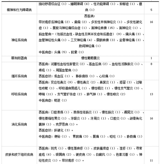 近些年,随着针灸研究的不断深入,已经形成了较为完善的针灸疾病谱体系[4-6]。蜂针疗法作为针灸特色疗法,有其自身特点,治疗病症的优势需要科学总结,因此,蜂针疾病谱还存在较大开发空间。本研究基于现代文献,采用ICD-10将蜂针临床的适应病种进行规范化,筛选蜂针的有效病种及优势病种,总结出的蜂针疗法的疾病谱。同时为了解该领域相关研究的发展进程,为日后研究提供一定的借鉴与参考。