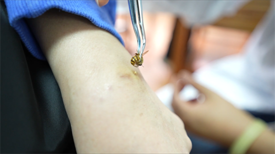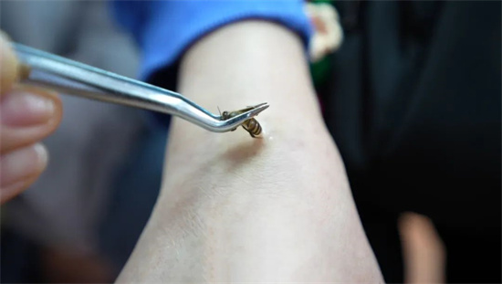 李教授也常将散点丛集刺法用于美容保健方面,如美容祛瑕疵者,可在斑点处散点刺,有活血化瘀、消除斑块之功,注意面部不宜用直刺丛集刺法,以免蜂针 不良反应引起面部肿胀、色素沉着,反而影响美观; 保健者可在足三里穴、关元、气海、命门等穴散点刺,另可配合服用蜂王浆等蜂产品,也可将蜂王浆与蜂蜜按1∶1的比例调和,2次/天,早晚饭前服用,有提高体质、延年益寿之功。