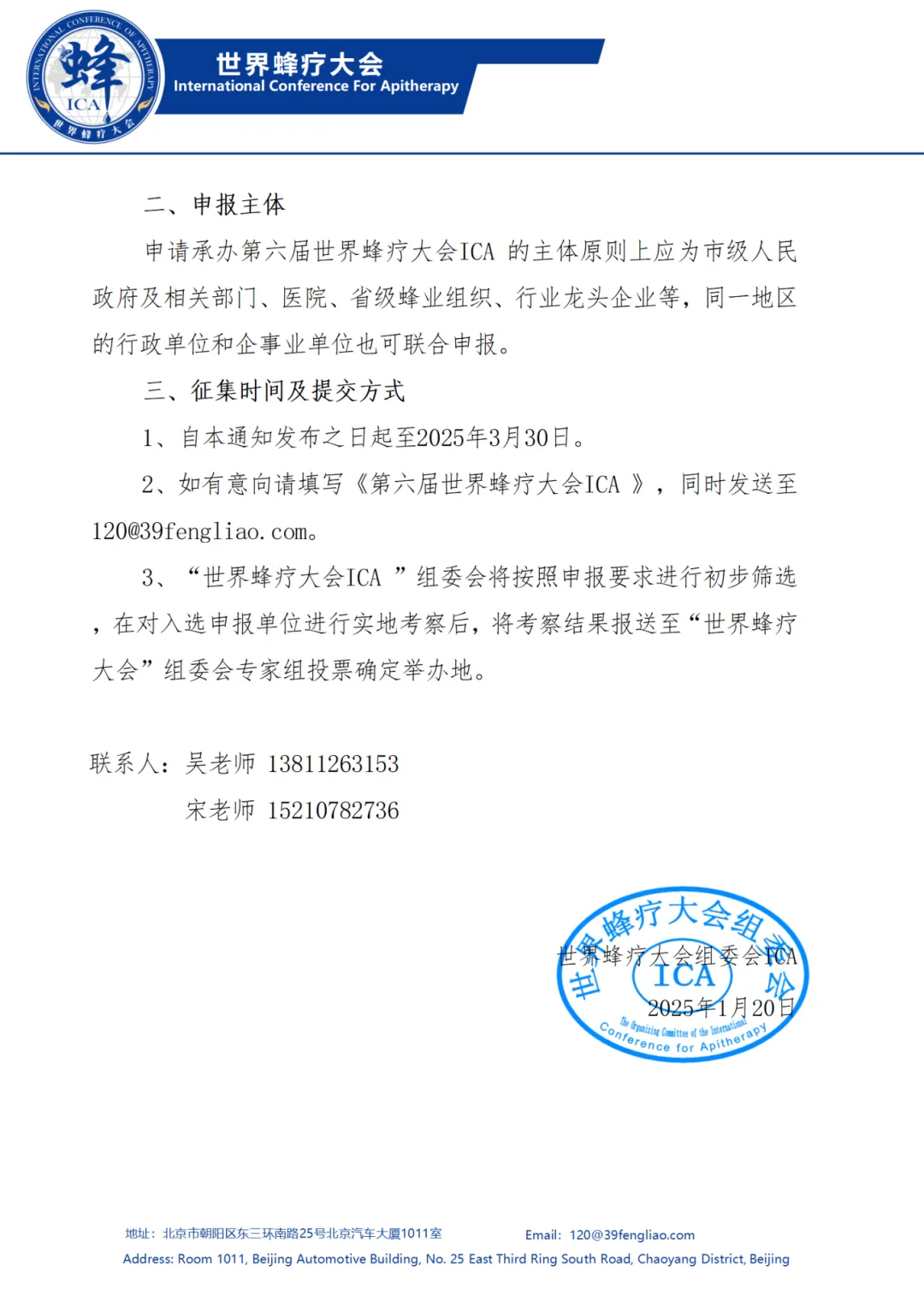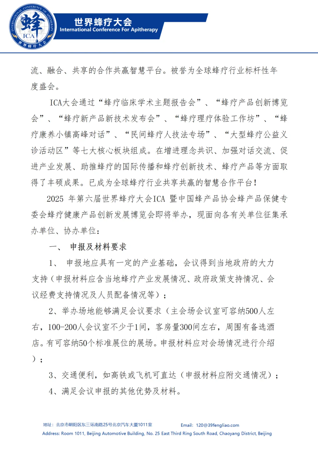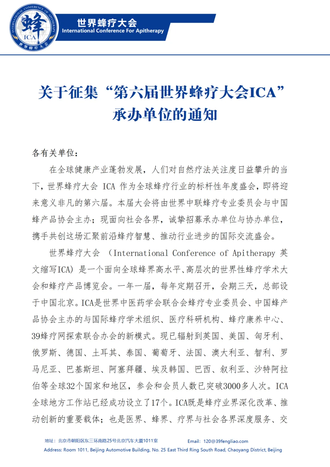 关于征集“第六届世界蜂疗大会ICA” 承办单位的通知