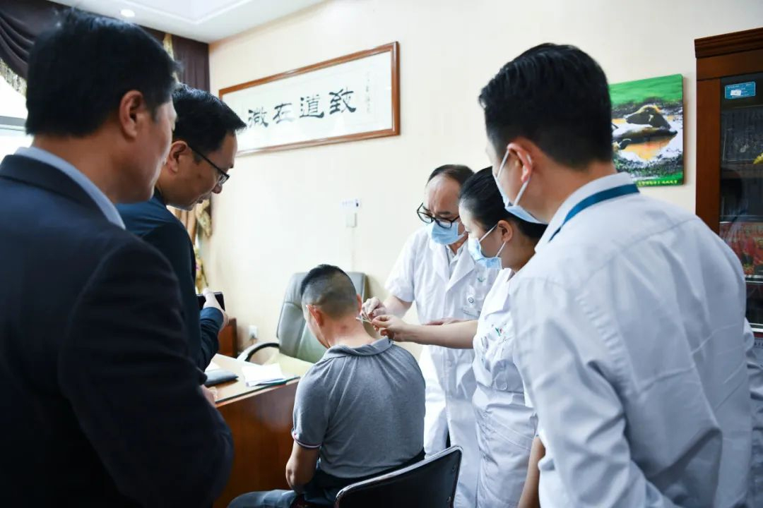 座谈会结束后,连云港市中医院代表团实地参观了市一院中医科。在参观过程中,陈文滨带领团队成员,向来访嘉宾展示了蜂疗的操作过程,并介绍了该疗法在鼻炎、腺样体肥大、高血压、头痛、肩背腰腿疼痛等疾病治疗中的显著效果。