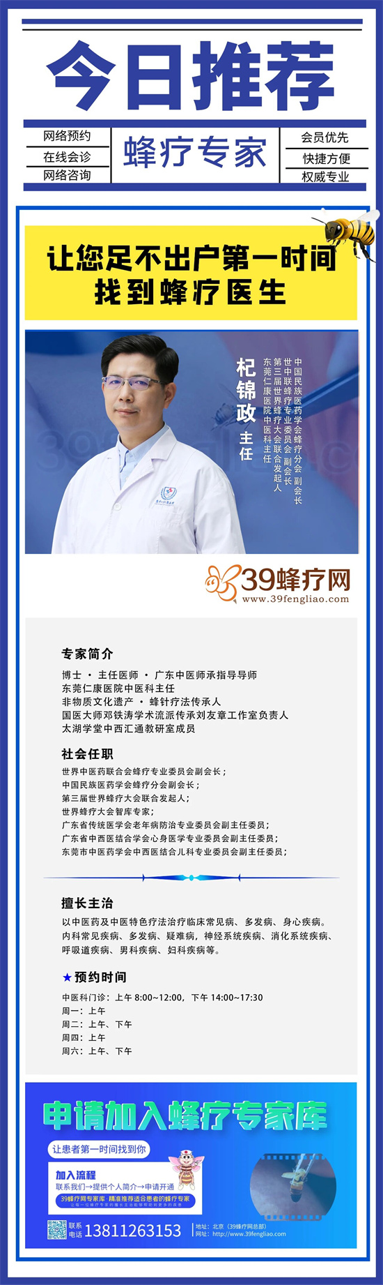 杞锦政荣誉等身,不仅在本职领域扎根深耕,更同时承担着更多更大的社会责任:第三届世界蜂疗大会联合发起人,世界蜂疗大会ICA·智库专家,世界中医药联合会蜂疗专业委员会副会长,广东省针灸针药结合专业委员会常务委员,广东省传统医学会委员,东莞市中医学会委员,广东省中医药学会疑难病专业委员会委员,广东省中医药学会老年病专业委员会委员……他用专业坚强承担起匠人般的责任担当,同时也用精湛医术帮助上万名患者摆脱病痛。杞锦政主任擅长以中医药及中医特色疗法治疗临床常见病、多发病、身心疾病。精通针刺、艾灸、蜂针、蜂蜡疗法、针刀、刃针、热敏灸、拔罐等中医特色疗法,主要诊治内科常见疾病、多发病、疑难病,神经系统疾病、消化系统疾病、呼吸道疾病、男科疾病、妇科疾病等多种病症,以中医、中药、中医特色疗法为主要诊治方案。