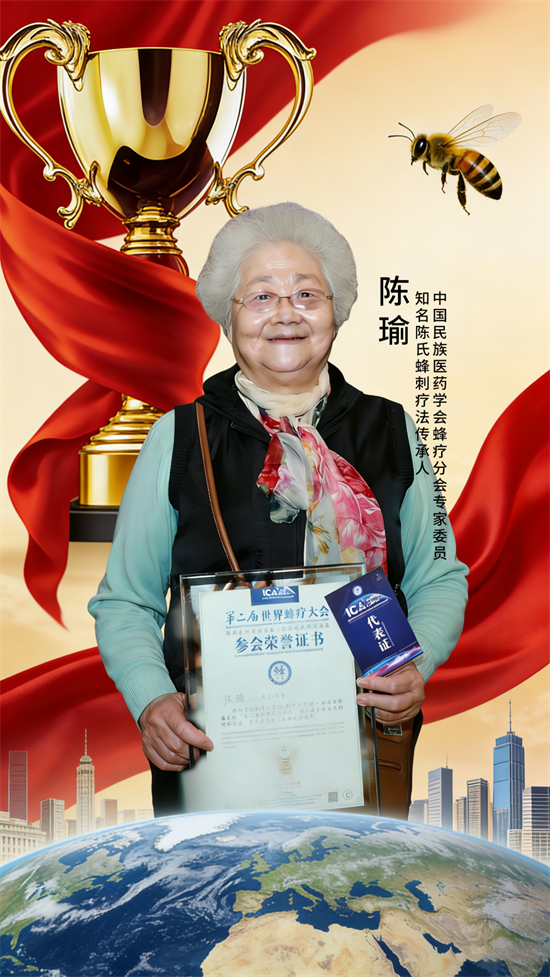 “卌载耕耘苗成林,仁心永续践初忱!” 更令我感动的是,2026年1月5日,我收到了大会秘书处寄来的“突出贡献奖”奖杯。八十六岁的我,手捧刻有自己照片的奖杯,不禁双手微颤,心情激动,甚至忘了用餐,第一时间便与亲友分享这份喜悦。这份荣耀,不仅是对我数十年来投身蜂疗事业的认可,也赋予我新的动力。回顾1986年至今,蜂疗已从一株嫩苗,蔚然成林,遍及世界。我虽年事已高,仍愿尽己所能,继续挖掘蜂疗的特效方法,让这一自然疗法惠及更多需要的人,不负大会所托,亦不负此生初心。