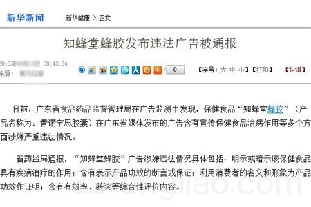 【原标题:食药监局发布违法医药广告 北京知蜂堂等上榜】