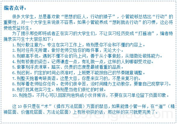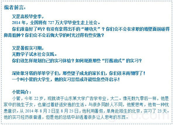 理论学习跟实践总是有差距的。刚开始的工作是进行视频截图,然后进行PS处理,还是跟专业有很大关系的。然而,这一项工作在接下来的几天反反复复修改了好几次。这一项工作结束之后,我总结了三方面的经验:第一,在接受工作的时候,首先要跟工作安排人员有一个很好的关于工作要求的沟通,工作的时间限度、质量标准等方面;第二,专业技术的学习如果不加以运用,在应用到实践工作的时候总是让人无从下手。所以在平时的专业学习中应该增加对实践需要的考虑;第三,工作过程中应该发挥自己的想法,不要被前人束缚了思维。