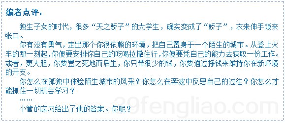 战胜孤独感。从来没有自己一个人在一个陌生的城市呆这么久,虽然我不是一个恋家的人,很多时候我还是想家了。没有家人和朋友的陪伴,寂寞总是在闲暇的时候向我袭来。为了避免孤独,我总是把自己的生活安排得很满,让充实的生活为我带来新鲜感和愉悦。尽管如此,我还是经常地给家人朋友打电话,一方面让他们知道我很好,不必担心,另一方面也可以让我得到心理安慰。