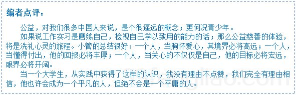 我的最深感受:一个人,当胸怀爱心,其境界必将高远;一个人,当懂得付出,他的回报必将丰厚;一个人,当关心的不仅仅是自己,他的目标必将宏远,眼界必将开阔。