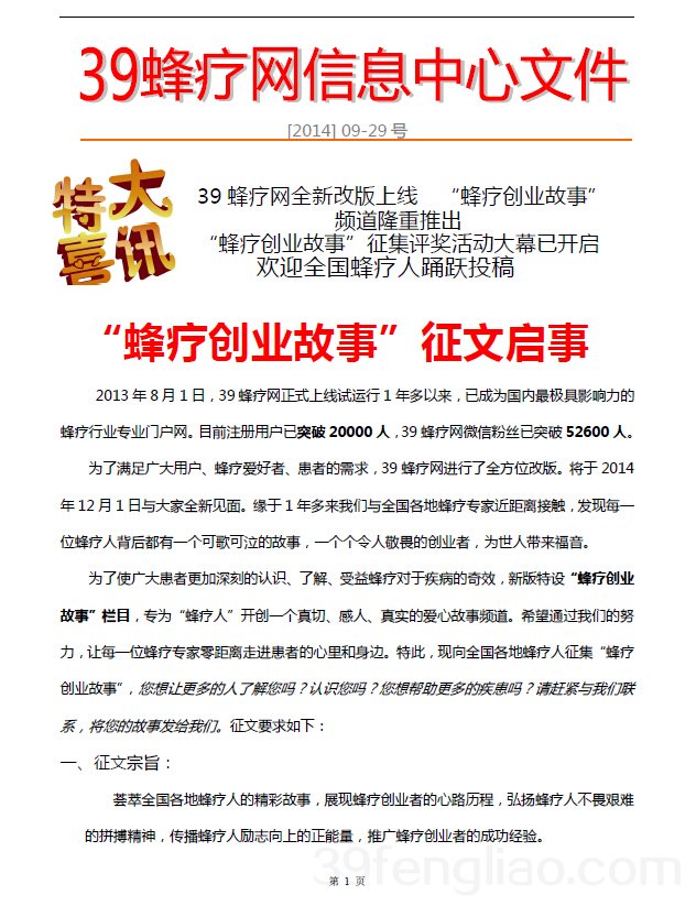 2. 2014年1月份,征文评选组委会将初选入围的文章挑选出来,给这些应征稿件做润色处理,并将之全部发布到39蜂疗网“蜂疗创业故事”频道。