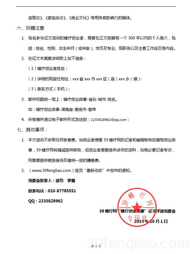 3. 邮件标题统一写上:蜂疗创业故事-省份-城市-姓名。